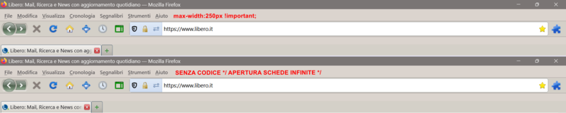 2. ANZICHE' USARE I MIEI DUE CODICI, VOGLIO SOLO AVERE UN NUOVO CODICE PER LA LARGHEZZA DI 250PX QUANDO NON E' CLICCATO ALL'AVVIO DEL BROWSER! QUESTO CODICE E' QUELLO IN CUI HO SEMPRE AVUTO FINORA SENZA QUELLE IN ROSSO, E QUINDI LA SCHEDA ATTIVA DIVENTA PIU' CORTA DI 250PX CHE E' DI DEFAULT DEL BROWSER E CHE LO RENDE VISIBILE IL PULSANTE DI NUOVA SCHEDA QUANDO TRASCINO SENZA CHE SI NASCONDE FINCHE' LO RILASCIO!