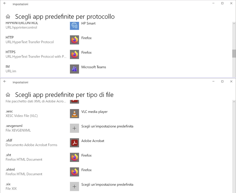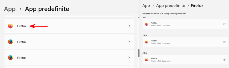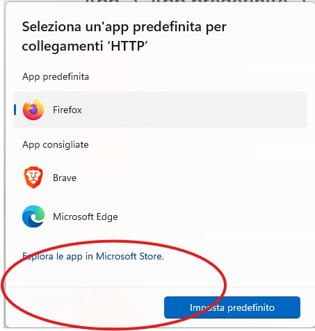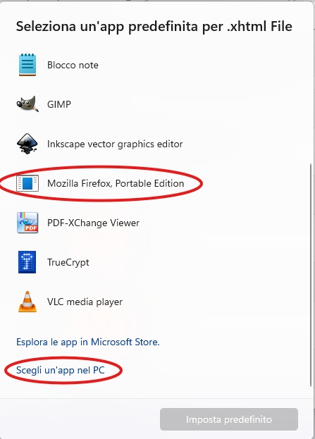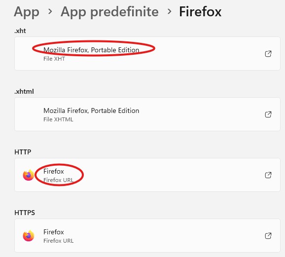 Tornando alla questione principale, nella sezione Firefox delle app predefinite (impostazioni di sistema di Windows 11), noto che c’è una differenza di comportamento, inteso come scelta app predefinita, tra i tipi di file e i collegamenti; ad esempio per i file in formato .html, .xht, o .xhtml il sistema fornisce la doppia scelta, ossia posso utilizzare Firefox “generico” (che poi non so da dove lo prenda) e Firefox portable, andando cioè nel percorso della cartella portable e che è poi dove c’è il profilo principale che voglio utilizzare sempre. Invece per i collegamento HTTP o HTTPS mi dà solo la possibilità di impostare il generico, se volessi scegliere un’altra app predefinita non c’è più il pulsante “Scegli un’app nel PC” per cui non posso andare a scegliere FF portable.