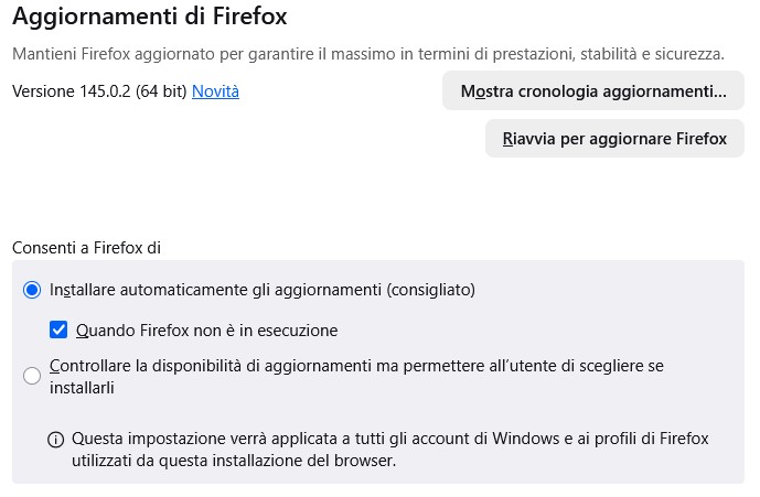Utilizzo infatti FF portable su un laptop, se clicco su un link da un’applicazione come Thunderbird mi apre Firefox in un nuovo profilo e, altra cosa strana, me lo aggiorna (esce “controllo aggiornamenti in corso” e li fa): tuttavia nelle impostazioni di FF Portable, alla voce aggiornamenti, erano già abilitati in automatico, ma non capisco per quale motivo non li faccia: