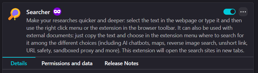 Se l'estensione non è visualizzata sulla barra, funziona tramite menu del tasto destro; altrimenti bisogna prima cliccare sull'icona a forma di puzzle, poi su quella di Searcher in modo da far aprire il popup (nei miei test funziona regolarmente; se mi dai i dettagli dei casi in cui non funziona, posso provare a riprodurre il difetto).