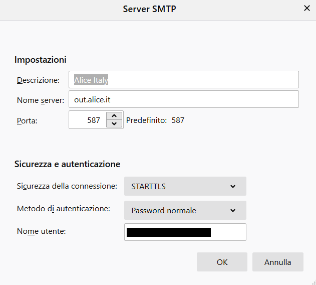 Il mio fornitore di posta e servizi è TIM, ho Thunderbird 140.4.0esr (64 bit), Windows 11 PRO 64bit, Avira Security.  Configurazione SMTP: Alice Italy - server: out.alice.it - Porta 587 - sicurezza: nessuna - Autenticazione: Pw su connessione non protetta - Utente: *****@alice.it.-