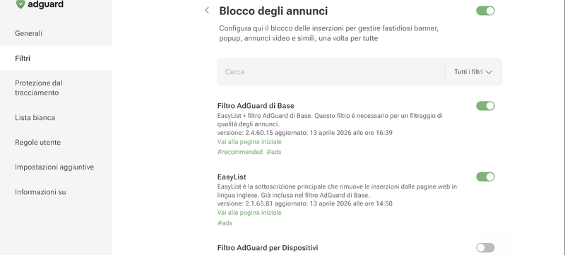 Su ublock lite, quali filtri devo spuntare nella scheda